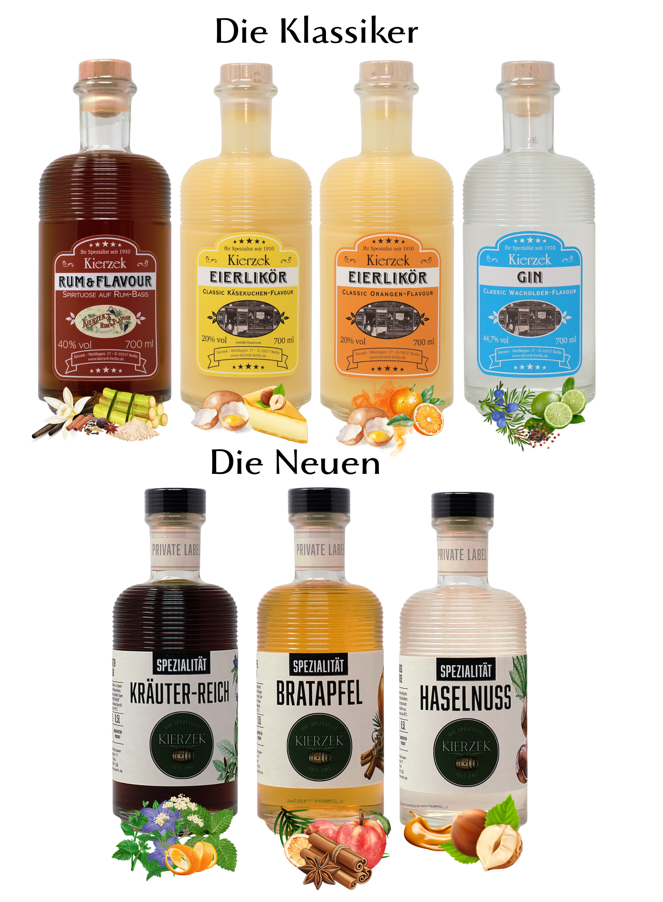 Der Spiced Rum von Kierzek ist ein Nicaragua Rum mit Noten von reifen Tropenfrüchten, Vanille, Schokolade, Karamell und kandierten Früchten. Kierzeks Eierlikör wartet mit Käsekuchen-Geschmack oder Orangen-Aroma auf. Der Gin und Classic Gin veredelt Wacholder mit Limette und etwas Pfeffer. Probieren Sie einfach mit unseren 0,2l Flaschen.